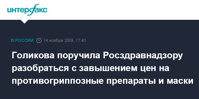 Голикова поручила Росздравнадзору разобраться с завышением цен на противогриппозные препараты и маски
