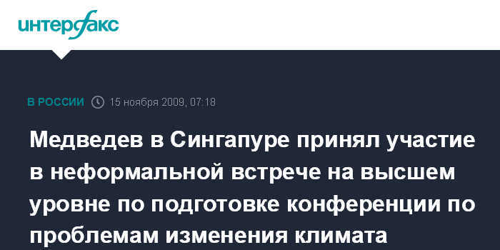 Сингапур. 15 ноября. ИНТЕРФАКС - Президент РФ Дмитрий Медведев рано утром в воскресенье в Сингапуре принял участие в неформальной встрече на высшем уровне по подготовке декабрьской конференции в Копенгагене по проблеме изменения климата.