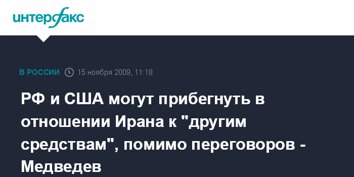 Сингапур. 15 ноября. INTERFAX.RU - Президент РФ Дмитрий Медведев заявляет, что Россия и США могут прибегнуть к "другим средствам" помимо переговоров, если Иран не даст ответа относительно своей ядерной программы. "Если не удастся договориться, то остаются другие средства, чтобы двигать процесс по-другому", - сказал Д.Медведев в совместном с президентом США Бараком Обамой заявлении для прессы после из переговоров. Цель переговорного процесса с Ираном - это добиться от Тегерана четких гарантий относительно "прозрачности ядерной программы, которая не вызывает озабоченностей у мирового сообщества", сказал Д.Медведев.