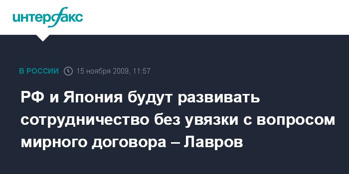 Сингапур. 15 ноября. INTERFAX.RU - Президент России Дмитрий Медведев и премьер-министр Японии Юкио Хатояма договорились решать вопрос заключения мирного договора без каких-либо увязок, заявил глава МИД РФ Сергей Лавров. "Вопросы заключения мирного договора и так называемая территориальная проблема тоже обсуждались. С нашей стороны была поддержана линия премьер-министра Хатоямы и его правительства о том, чтобы двигаться параллельно по всем направлениям...", - сказал С.Лавров журналистам в Сингапуре.
