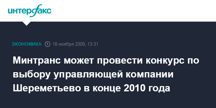 Москва. 16 ноября. INTERFAX.RU - Минтранс РФ готовит передачу имущества аэропорта "Шереметьево" в управление, конкурс по выбору инвестора может быть объявлен в конце 2010 года, заявил глава министерства Игорь Левитин на пресс-конференции в центральном офисе "Интерфакса" в понедельник.