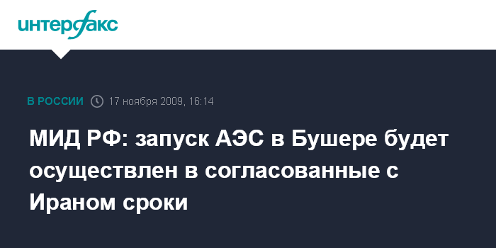 МИД РФ: запуск АЭС в Бушере будет осуществлен в согласованные с Ираном сроки