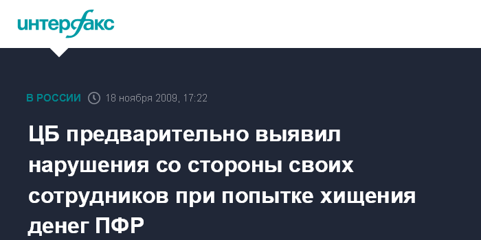 Москва. 18 ноября. INTERFAX.RU - ЦБ РФ предварительно выявил нарушения со стороны своих сотрудников при попытке хищения средств в размере 1,25 млрд рублей со счетов Пенсионного фонда, сообщил журналистам в среду глава Банка России Сергей Игнатьев.