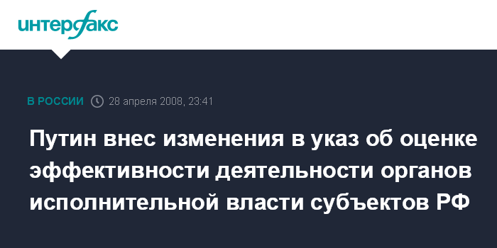 Москва. 28 апреля. ИНТЕРФАКС - Президент Владимир Путин подписал изменения в указ "Об оценке эффективности деятельности органов исполнительной власти субъектов Российской Федерации", сообщила пресс- служба президента.