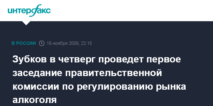 Москва. 18 ноября. ИНТЕРФАКС - Первый вице-премьер РФ Виктор Зубков в четверг проведет первое заседание правительственной комиссии по регулированию алкогольного рынка, сообщил источник в правительстве РФ.