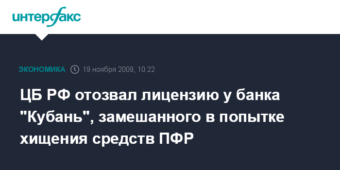 ЦБ РФ отозвал лицензию у банка "Кубань", замешанного в попытке хищения средств ПФР