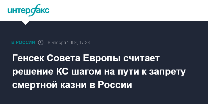 "Смертная казнь - это неприемлемая форма наказания, и ее запрет является обязательством всех государств-членов Совета Европы. Заявление Конституционного суда России - это важный шаг на пути к запрету смертной казни в России", - отметил генсек Совета Европы.