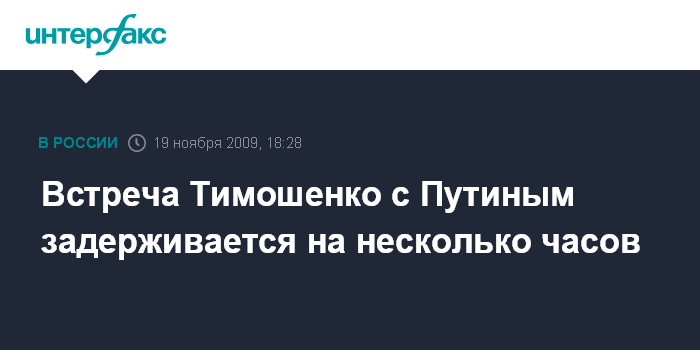 Киев. 19 ноября. INTERFAX.RU - Встреча премьеров России и Украины Владимира Путина и Юлии Тимошенко задерживается на несколько часов, сообщили агентству "Интерфакс" представители российской делегации.
