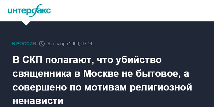 Москва. 20 ноября. INTERFAX.RU – Следствие убеждено, что основным мотивом убийства священника Даниила Сысоева в Москве является религиозная ненависть.