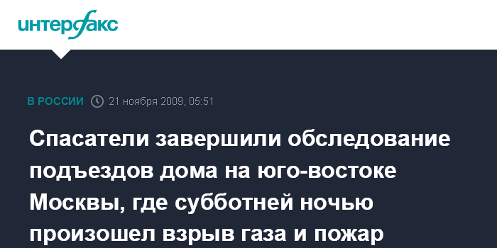 Москва. 21 ноября. ИНТЕРФАКС - Спасатели завершили обследование подъездов многоэтажного жилого дома на улице Юных Ленинцев в московских Кузьминках, в подвале которого субботней ночью произошел взрыв газа, сообщает корреспондент "Интерфакса" с места событий.