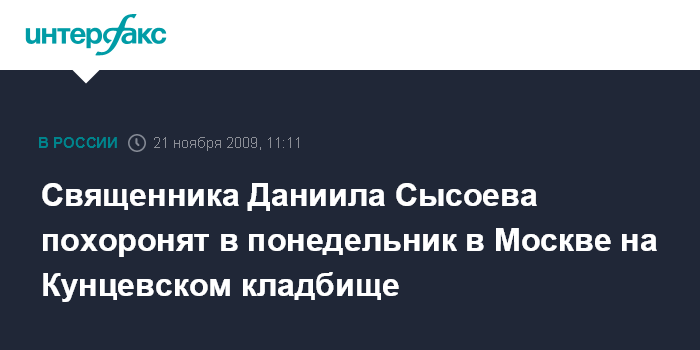 Москва. 21 ноября. INTERFAX.RU - Похороны священника Даниила Сысоева, убитого в ночь на пятницу в Москве, состоятся в понедельник на Кунцевском кладбище.