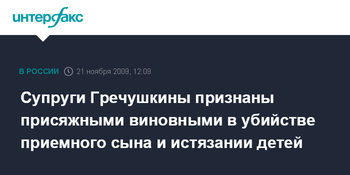 Москва. 21 ноября. INTERFAX.RU - Присяжные Московского областного суда вынесли обвинительный приговор по громкому делу в отношении супругов Гречушкиных, обвиняемых в жестоком убийстве приемного сына и истязании приемных детей.