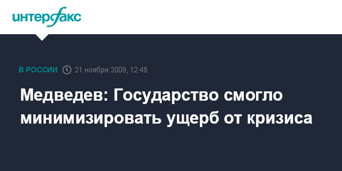 Москва. 21 ноября. INTERFAX.RU - Президент РФ Дмитрий Медведев заявил, что государству удалось минимизировать ущерб от последствий глобального кризиса, однако российская экономика все еще чрезмерно зависит от мировой конъюнктуры.