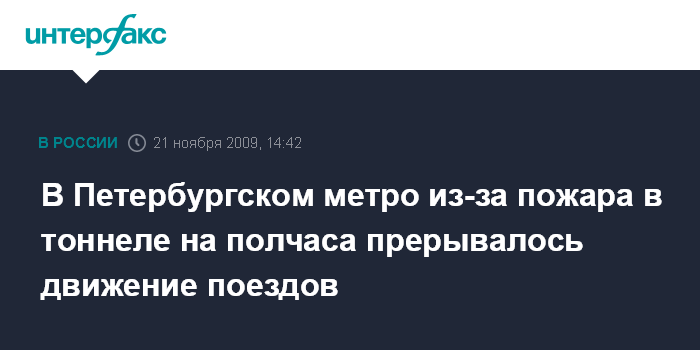 Москва. 21 ноября. INTERFAX.RU - На "красной" ветке Петербургского метрополитена из-за возгорания в тоннеле в субботу днем прерывалось движение поездов.