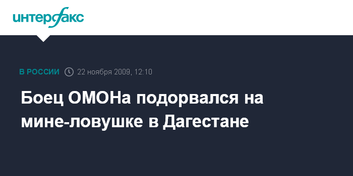 Махачкала. 22 ноября. INTERFAX.RU - У входа на территорию базы ОМОН-1 МВД Дагестана в Махачкале произошел взрыв. Как сообщил "Интерфаксу" в воскресенье начальник пресс-службы МВД Дагестана Марк Толчинский, инцидент произошел примерно в 10:05. "Боец ОМОН хотел убрать с капота своей машины какой-то посторонний предмет, оказавшийся миной-ловушкой. В результате взрыва он получил тяжелое ранение и находится в реанимации", - сообщил М.Толчинский.