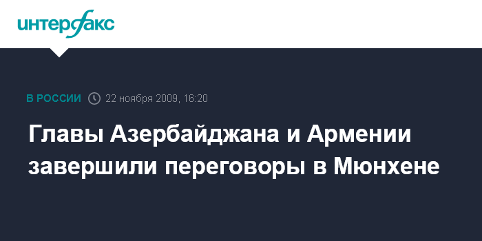 Баку. 22 ноября. INTERFAX.RU - Встреча президентов Азербайджана Ильхама Алиева и Армении Сержа Саргсяна прошла 22 ноября в резиденции генерального консула Франции в Мюнхене, сообщили "Интерфакс-Азербайджан" в администрации азербайджанского президента. В ходе переговоров был проведен обмен мнениями о нынешнем состоянии и перспективах переговоров по урегулированию армяно-азербайджанского, нагорно-карабахского конфликта.