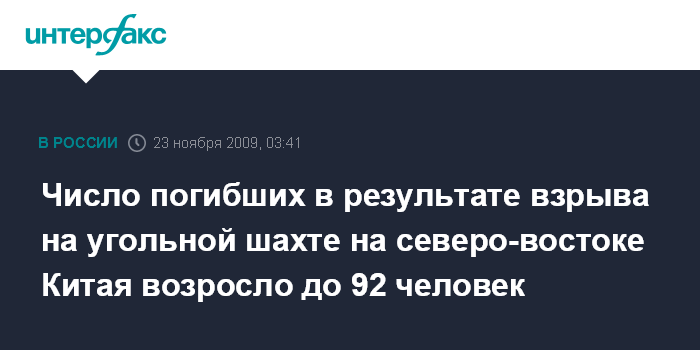 Пекин. 23 ноября. ИНТЕРФАКС-КИТАЙ - Число жертв взрыва метана на угольной шахте в северо-восточной китайской провинции Хэйлунцзян составило 92 человека, еще 16 горняков числятся пропавшими без вести.