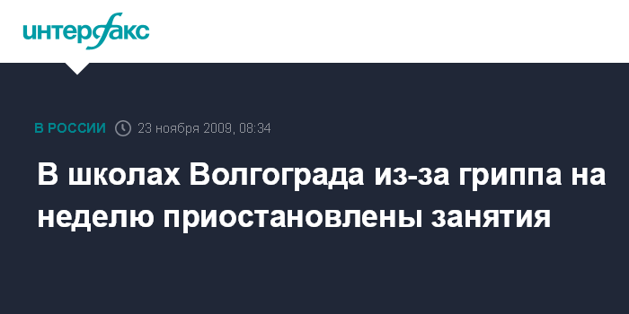 Москва. 23 ноября. INTERFAX.RU - В Волгограде из-за высокой заболеваемости гриппом во всех образовательных учреждениях города введен карантин.