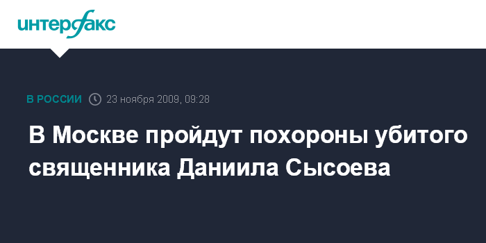Москва. 23 ноября. INTERFAX.RU - В этот понедельник православная Москва простится со священником Даниилом Сысоевым, убитым на минувшей неделе в храме Апостола Фомы, настоятелем которого он был.