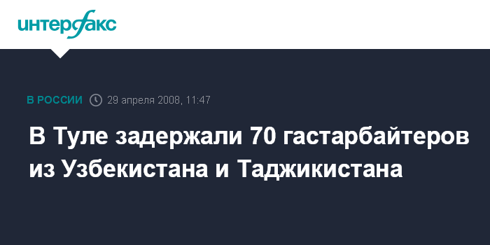 Тула. 29 апреля. INTERFAX.RU - В Туле в минувший понедельник задержали 70 граждан Узбекистана и Таджикистана, сообщил "Интерфаксу" во вторник сотрудник пресс-службы УВД региона Сергей Сергейчев. По его словам, разрешения на работу гастарбайтеров вызвали сомнения в подлинности.