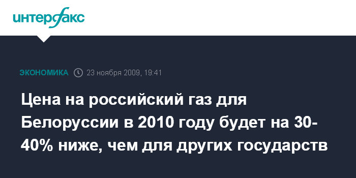 Цена на российский газ для Белоруссии в 2010 году будет на 30- 40% ниже, чем для других государств