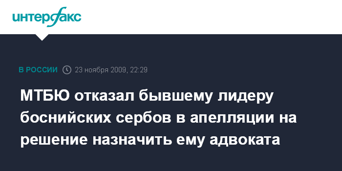 Гаага. 23 ноября. ИНТЕРФАКС - Международный трибунал по бывшей Югославии в понедельник отказал бывшему политическому лидеру боснийских сербов Радовану Караджичу в праве на подачу апелляции на решение судей назначить ему юридического советника.