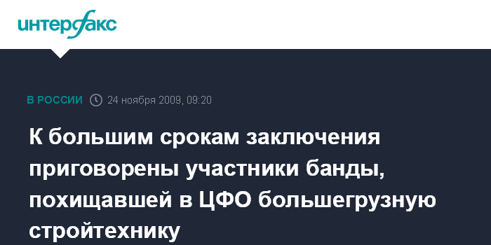 Москва. 24 ноября. INTERFAX.RU - К большим срокам заключения приговорены участники и главарь банды, которая в течение трех лет совершала разбойные нападения на водителей большегрузной строительной техники в Московском регионе и соседних областях, сообщили "Интерфаксу" в пресс-службе Следственного комитета (СК) при МВД РФ.