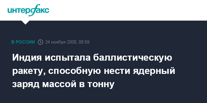 Москва. 24 ноября. INTERFAX.RU - Индийские власти провели испытание баллистической ракеты средней дальности "Агни-II", способной нести ядерные боеголовки, сообщила во вторник британская телерадиокорпорация ВВС.