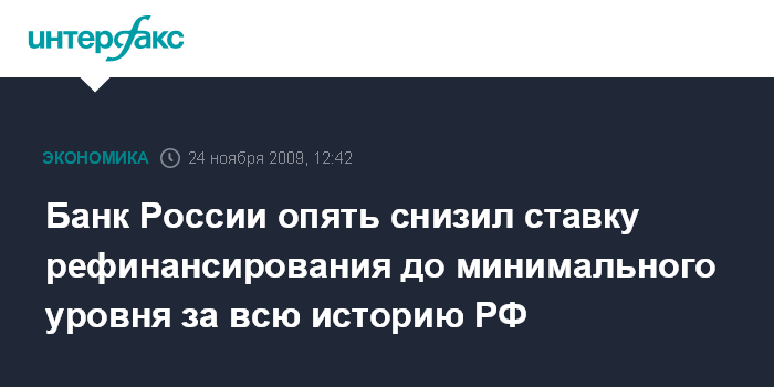 Москва. 24 ноября. INTERFAX.RU - С 25 ноября 2009 г. Банк России снижает ставку рефинансирования и процентные ставки по отдельным операциям Банка России на 0,5 процентного пункта. ЦБ РФ в этом году снижает ставку рефинансирования девятый раз.