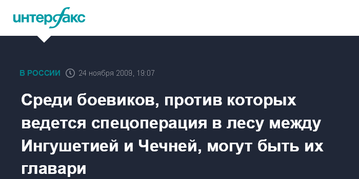 Грозный. 24 ноября. INTERFAX.RU - На сопредельной территории между Чечней и Ингушетией проводится спецоперация по поиску главарей незаконных вооруженных формирований (НВФ), сообщил журналистам в Грозном президент Чеченской республики Рамзан Кадыров.