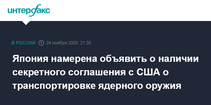 Вашингтон. 24 ноября. INTERFAX.RU - Новое правительство Японии намерено предъявить доказательства наличия секретного соглашения с США, в соответствии с которым американские суда и самолеты, перевозившие ядерное оружие могли делать остановки на японской территории, сообщает во вторник американская газета Washington Post.