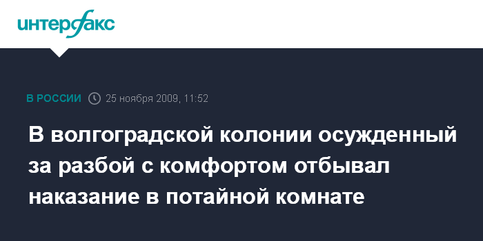 Москва. 25 ноября. INTERFAX.RU - Сотрудники волгоградской прокуратуры по надзору за соблюдением законов в исправительных учреждениях во время проверки лечебно-исправительного учреждения N15 в Волгограде обнаружили потайное помещение, оборудованное под жилую комнату. Как сообщает в среду пресс-служба областной прокуратуры, в помещении площадью около 17 кв. метров проживал один из осужденных, отбывающий наказание за разбой в виде 8,5 лет лишения свободы. Как отмечается в сообщении, с 2007 года он содержался в лечебном учреждении, где осужденные проходят лечение от туберкулеза, хотя сам был абсолютно здоров.