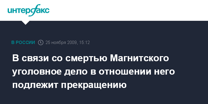 В связи со смертью Магнитского уголовное дело в отношении него подлежит прекращению