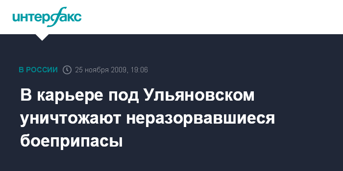 Москва. 25 ноября. INTERFAX.RU - Под Ульяновском в специально отведенном карьере в среду уничтожены боеприпасы, собранные на территории 31-го арсенала ВМФ после пожара, сообщил "Интерфаксу" врид начальника управления пресс-службы и информации Минобороны РФ полковник Алексей Кузнецов.