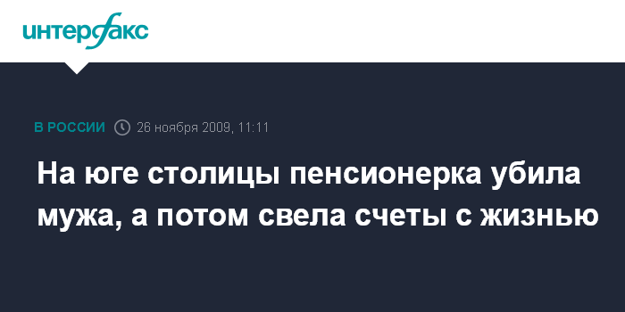 Москва. 26 ноября. INTERFAX.RU - Жительница Москвы накануне убила мужа, а затем покончила жизнь самоубийством, выбросившись из окна, сообщил "Интерфаксу" источник в правоохранительных органах в четверг.