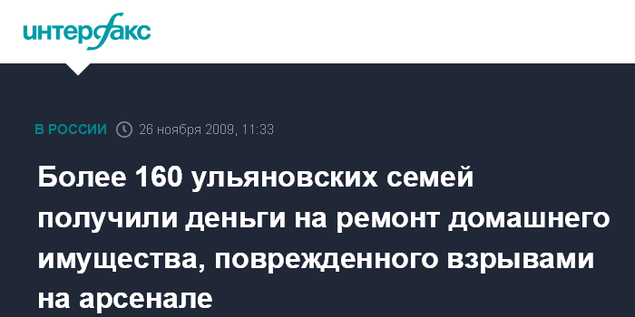 Москва. 26 ноября. INTERFAX.RU - В Ульяновске до 1 декабря принимаются заявки на ремонт квартир, пострадавших вследствие взрывов на военном арсенале, произошедших 13 ноября.