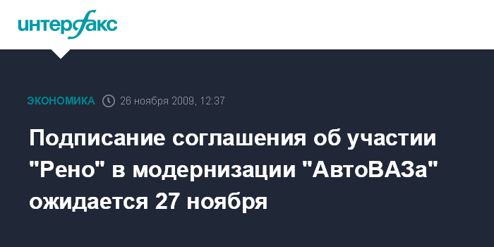 Москва. 26 ноября. INTERFAX.RU - Россия и Франция, как ожидается, подпишут 27 ноября соглашение по участию "Рено" в спасении "АвтоВАЗа", сообщил российский посол во Франции Александр Орлов.