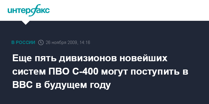 Москва. 26 ноября. INTERFAX.RU – ВВС России в 2010 г. планируют получить еще пять дивизионов зенитных ракетных систем (ЗРС) С-400 "Триумф" в дополнение к двум имеющимся дивизионам ЗРС С-400, сообщил главком ВВС генерал-полковник Александр Зелин.