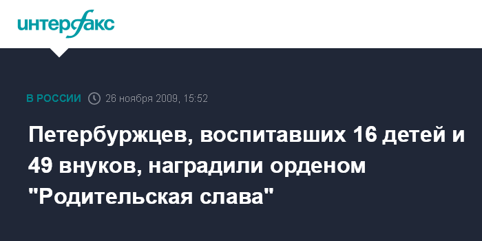 Москва. 26 ноября. INTERFAX.RU - В Петербурге в четверг впервые прошла торжественная церемония награждения орденом "Родительская слава", сообщает пресс-служба городской администрации. "В Петербурге, единственном регионе России, награждены супруги сразу двух семей - Шатровых и Скрипко. Семья Шатровых вырастила 16 детей. Сейчас в ней воспитывается 49 внуков и одна правнучка. В семье Скрипко - 14 детей", - говорится в сообщении.