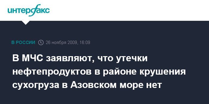 Москва. 26 ноября. INTERFAX.RU - Специалисты МЧС РФ и Росприроднадзора исследуют место крушения сухогруза "Берилл" в Азовском море. "Утечек нефтепродуктов из затонувшего сухогруза нет, на поверхности лишь несколько небольших масляных пятен", - сообщили агентству "Интерфакс-Юг" в пресс-службе Южного регионального центра МЧС РФ в четверг.