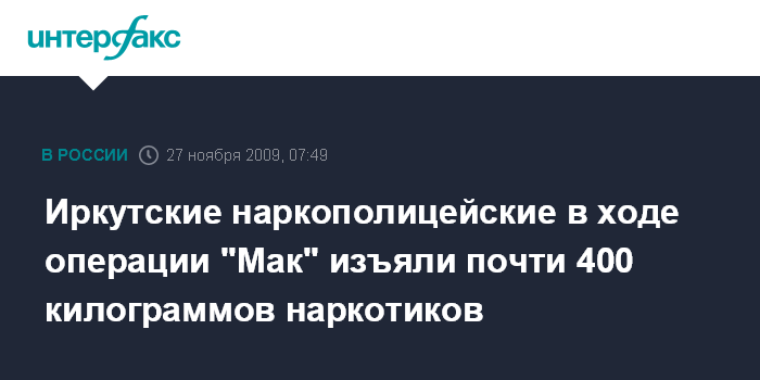 Иркутск. 27 ноября. ИНТЕРФАКС-СИБИРЬ - На территории Иркутской области в ходе операции "Мак-2009" обнаружено 310 очагов произрастания дикорастущей конопли на площади почти 700 гектаров.