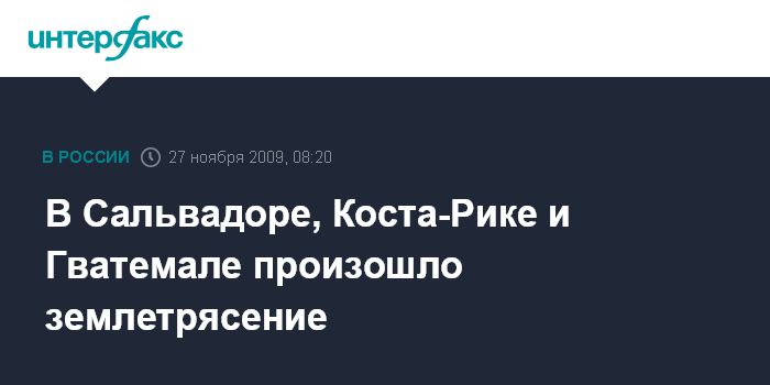 Москва. 27 ноября. INTERFAX.RU – Землетрясение магнитудой от 4,5 до 6,0 зафиксировано в четверг в Сальвадоре, Коста-Рике и Гватемале, сообщает британская вещательная корпорация BBC.