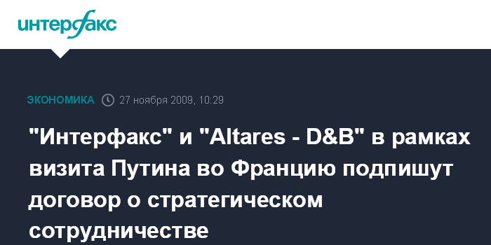 "Интерфакс" и "Altares - D&B" в рамках визита Путина во Францию подпишут договор о стратегическом сотрудничестве