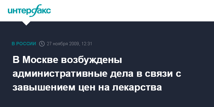 Москва. 27 ноября. INTERFAX.RU - В Москве выявлены фармацевтические фирмы, завышавшие цены на продаваемые лекарства от 129% до 380%, сообщила начальник Управления Генпрокуратуры РФ Лариса Коптева. "Солнцевским межрайонным прокурором Москвы возбуждено уголовное дело об административном правонарушении по статье 14.6 КОАП РФ в отношении ООО "Ольга Фарм" в связи с завышением более чем на 380% торговой наценки на отдельные лекарственные средства", - сказала Коптева в пятницу на совещании в Москве. Кроме этого, по ее словам, в аптечных пунктах, расположенных на территории железнодорожных вокзалов Москвы, "продажа жизненно необходимых лекарственных средств осуществлялась по ценам, превышающим предельно допустимые нормы".