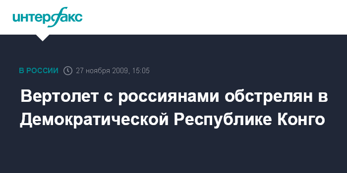 Москва. 27 ноября. INTERFAX.RU - В Демократической Республике Конго (ДРК) был обстрелян работающий по контракту с Миссией ООН вертолет с российскими гражданами на борту, сообщает МИД РФ.