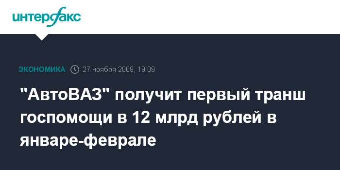 Париж. 27 ноября. INTERFAX.RU - АО "АвтоВАЗ" получит первый транш госпомощи в 12 млрд рублей в январе-феврале 2010 года, сообщил журналистам вице-премьер РФ Игорь Сечин.