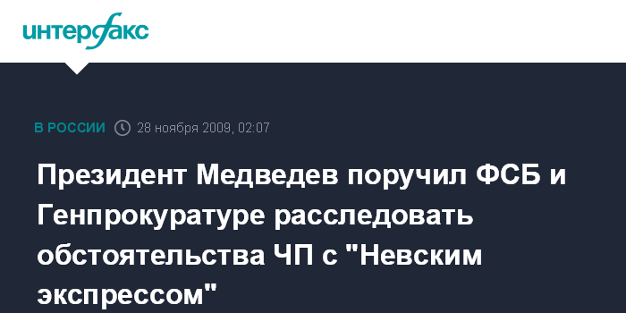 Москва. 28 ноября. ИНТЕРФАКС - Президент России Дмитрий Медведев поручил Шойгу, Бортникову и Чайке выяснить обстоятельства ЧП с "Невским экспрессом"