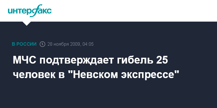 Москва. 28 ноября. ИНТЕРФАКС - Министерство по делам ЧС РФ подтверждает гибель 25 пассажиров "Невского экспресса".