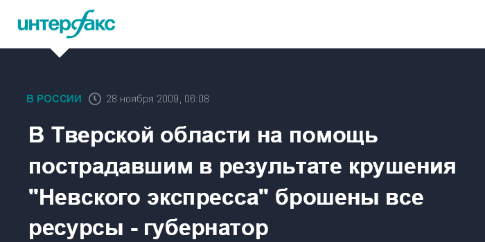Тверь. 28 ноября. ИНТЕРФАКС-ЦЕНТР - Тверская область мобилизовала все ресурсы для помощи пострадавшим в результате крушения "Невского экспресса", сообщил в субботу "Интерфаксу" губернатор региона Дмитрий Зеленин.