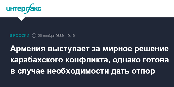 Москва. 28 ноября INTERFAX.RU - Армения выступает за мирное урегулирование карабахского конфликта, однако готова отреагировать соответствующим образом на притязания в отношении Нагорного Карабаха, заявил президент Армении Серж Саргсян.